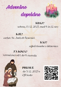 13. 12. 2025 pripravljamo adventno dopoldne. Najprej si bomo pogledali risanko, nato pa se bomo preizkusili v izdelovanju božičnih voščilnic.